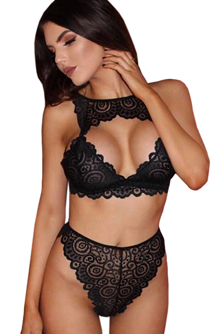 Halterneck Hollow Out Plunge Bra and Matching Panties Set