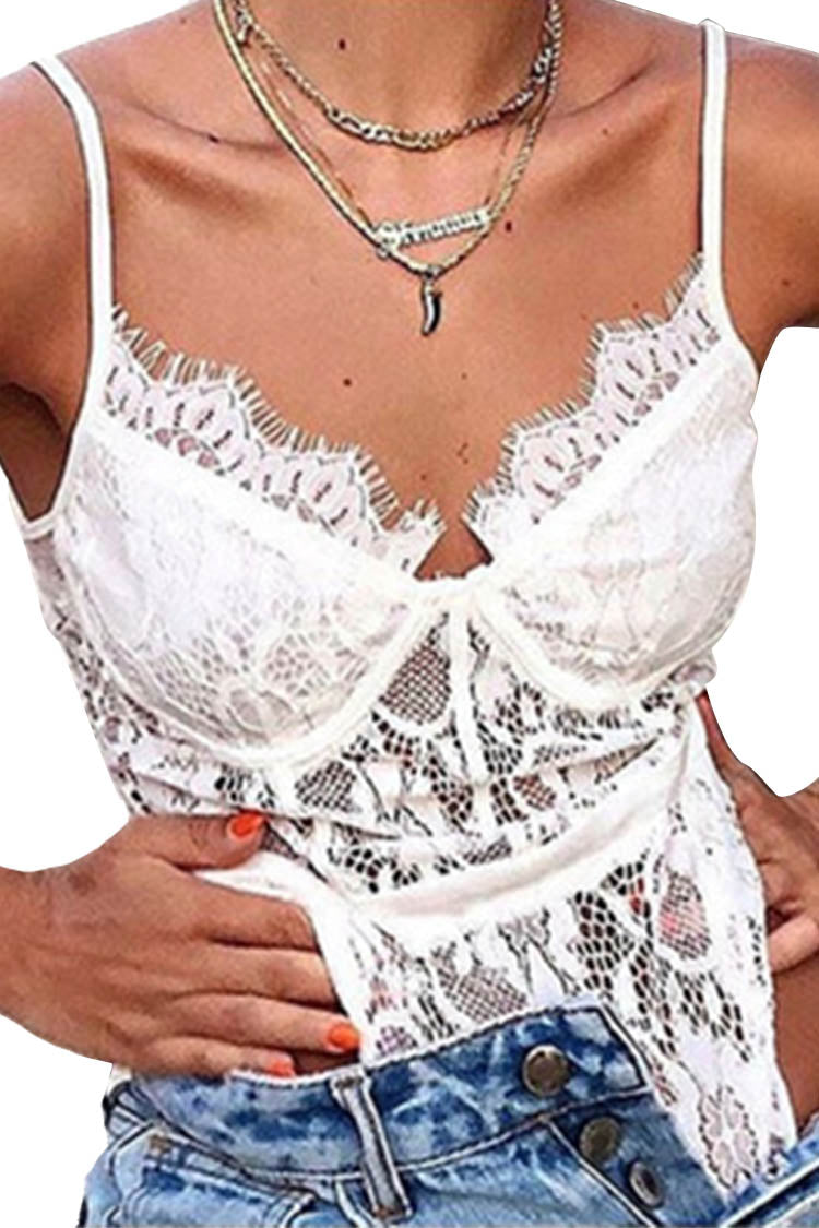 Women's Floral Strappy Longline Sheer Lace Bralette Transparent Fringe Tank Cami Crop Tops