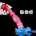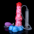 This is an innovative inflatable ejaculation dildo with red and blue color combination, realistic anatomical appearance and texture, which has excellent visual impact and functional experience.