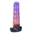 Rich textures: The ovipositor dildo uses a purple, yellow, and black gradient. The insertable length is about 9 inches, the tip is smaller and bud shaped, and the base is thicker with an average diameter of about 2 inches. Raised dragon head details, scale like patterns, and other irregular bumps create layered friction. When you contract and push the eggs out, you can also feel the raised vein like textures on their surface.
