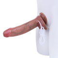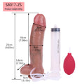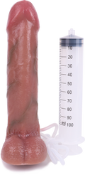 This is a super-realistic water-ejaculating dildo: its rounded "foreskin" glans and slightly curved shaft complement the skin's folds and vascular patterns, providing smooth, lifelike penetration. The thickened base and simulated scrotum provide both a secure stop and added friction in prone and cowgirl positions. It features a built in food grade hose with a concealed nozzle that remains flexible. It also offers two modes: an external graduated syringe (for a single burst of precise dosing) and a hand-operated airbag (for continuous, rhythmic ejaculation). No body fluids are exchanged, ensuring safety and preventing pregnancy. A strong suction cup secures it to smooth surfaces like glass, tile, and mirrors, allowing for hands-free use in a variety of positions. Made of high quality silicone, it's non-toxic, odorless, non-porous, and easy to clean, ensuring realistic, comfortable, and safe play.