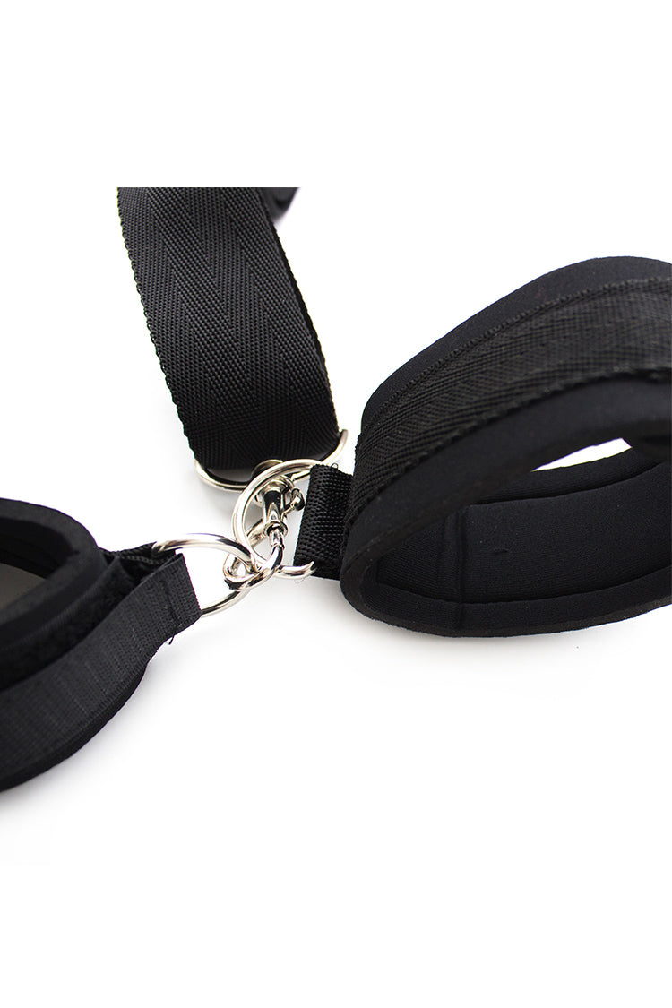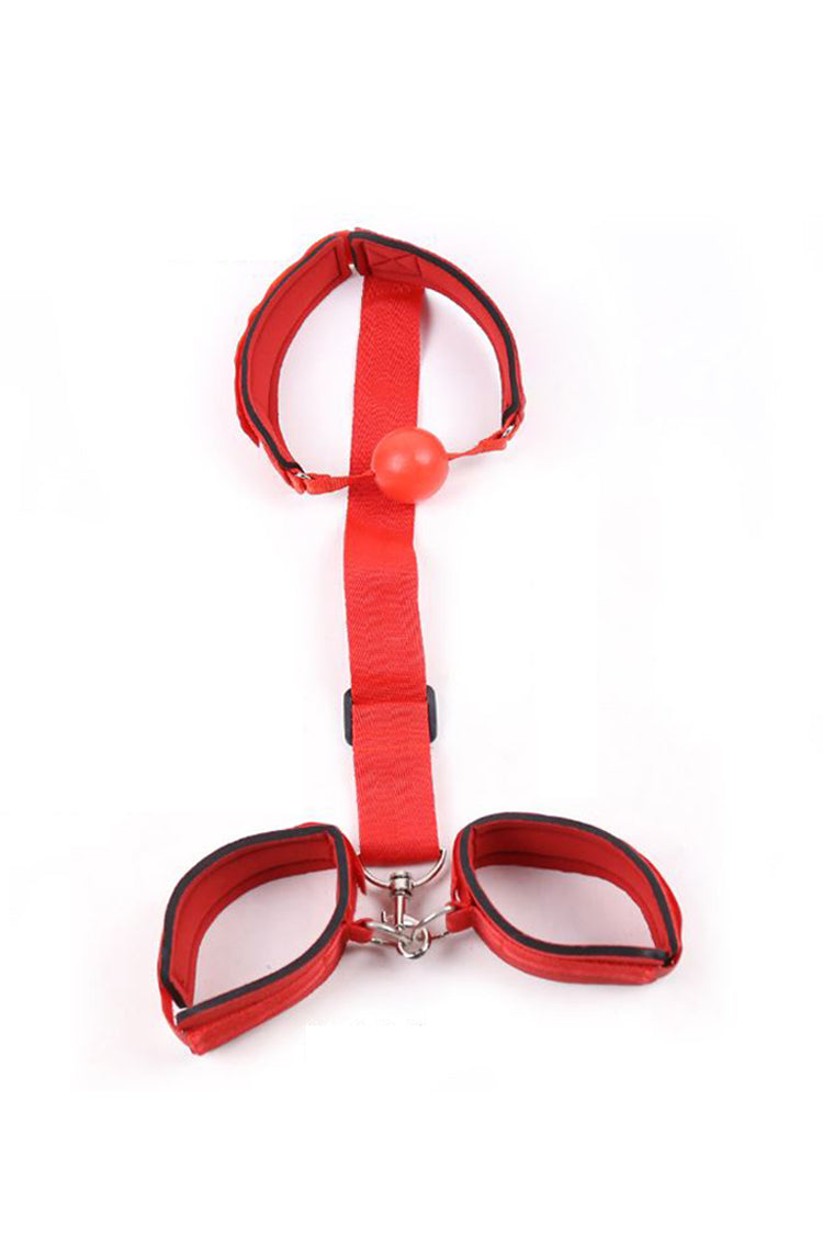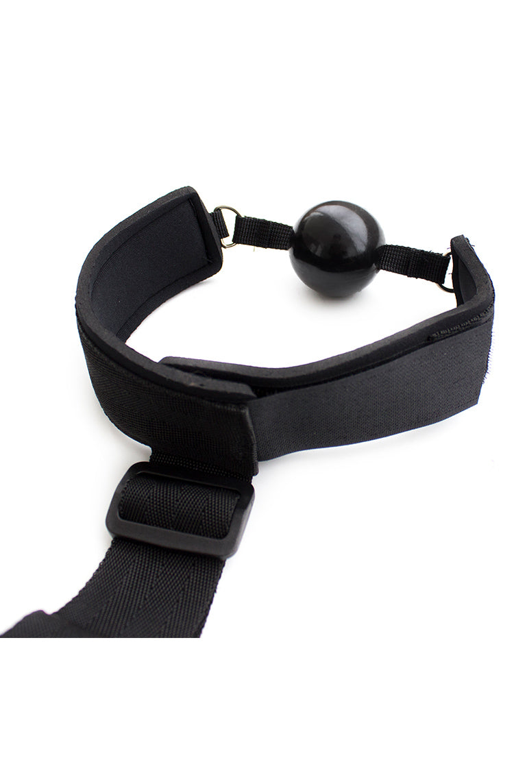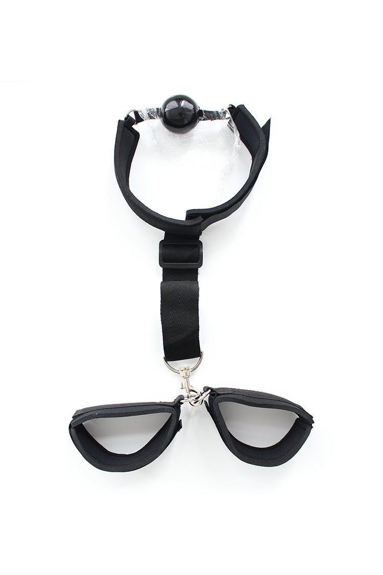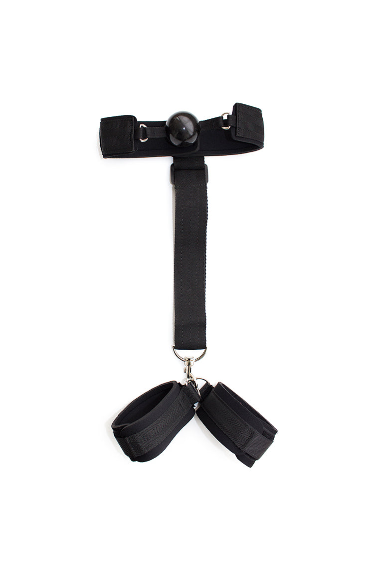 Strap in for a night of restraint play with this clever wrist to ball gag position restraint. Secure your lover's wrists behind their back with the soft cuffs to expose them to a night of pleasure (or pain) and excitement.