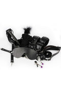 plush 10 piece set, leather 10 piece set (Blindfold, Collars, Whip, Ball gag, Handcuffs, Anklecuffs, Hog ties, Rope, Nipple Clamps, Feather)
