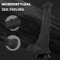 The Fantasy Horse Dildo is a horse penis fantasy dildo designed for players who enjoy size play and seek the ultimate experience. Crafted from black silicone, it boasts a lifelike appearance with a long, textured shaft and full, bulbous testicles at the base. This realistic horse fantasy dildo combines intense stretching sensations, exaggerated textures, and stunning visual effects for the ultimate sensory pleasure. From the thick, folded shaft to the robust, rounded glans, every aspect of this giant horse dildo is designed to provide friction, scraping, and massaging sensations with every thrust. The wide, bulbous base adds weight and stability, while the suction cup allows you to secure this black horse dildo to smooth surfaces for hands-free riding. The blunt, flared design creates a unique "popping" sound upon insertion, and the widest part passing through the opening provides an intense stretching sensation. This shape makes this toy ideal for users who enjoy the feeling of being completely filled.