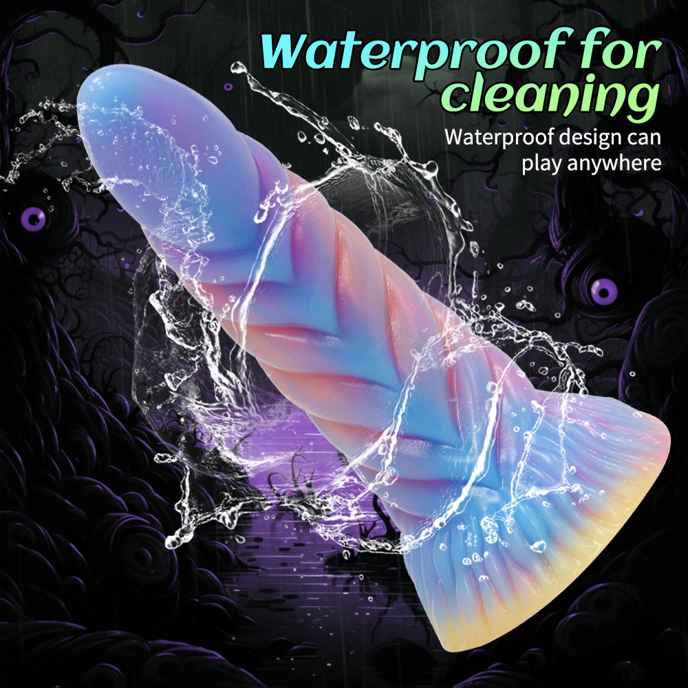 - This glowing monster dildo features a curved shaft designed to precisely target your pleasure points, whether used vaginally or anally.