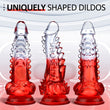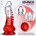 Release Your Fantasies with the Scaly Texture Clear Dragon Dildo. This captivating toy features a unique transparent design that transitions from crystal clear to fiery red, embodying the fierce allure of a dragon. Raised scales mimic dragon skin, adding a distinct tactile experience for intense stimulation.