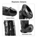 - Realistic Details: The appearance of this black dildo is designed with realistic details, featuring a sculpted head and protruding veins that stimulate pleasure zones within. The balls at the base ensure safety and provide impact to external sensitive areas when fully inserted.