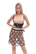 Amazing black harness cage style skirt, with individual black leather style straps linked together with silver o-rings and stud fasteners. Makes you more attractive and sexy while you enjoy the party or travel.You will be irresistible! Put it on with a skirt, dress or with jeans!