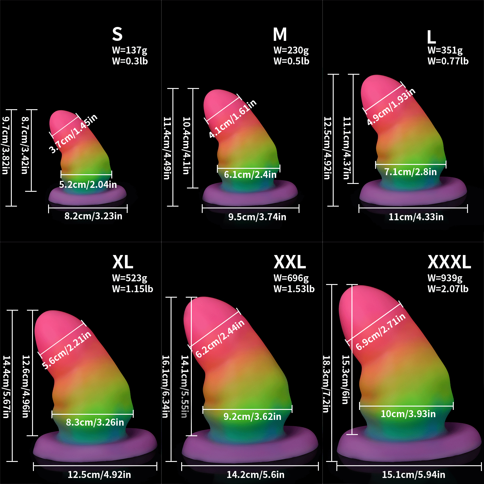 | Size | Total Length (cm/in) | Insertable Length (cm/in) | Max Diameter (cm/in) | Base Diameter (cm/in) | Weight (g/lb) |