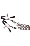 Imagine the seductive combination of collar and clamp, pleasure and pressure. This duo features a 15.94 inch chain and splits in two. Each chain ends at an adjustable alligator style nipple clamp, easily made tighter with thumb screws. Adorn the neck of your naughty one with this striking collar, as the chain dangles seductively against their chest.