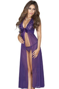 Just pull it on, tie in back - and step into the limelight! Every move you make, he'll be watching you: from the high neck, to the daring, deep plunging neckline, past sheer lace cups hugging your curves, down to the leg-baring high front slit!
