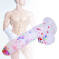 - This confetti-filled dildo features a frosted texture, offering a playful appearance with intense sensations.