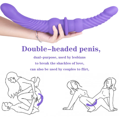 This purple double-ended dildo features curved ends and is 17 in 43 cm long. One end is 3.5 cm 1.38 in diameter and 19 cm 7.48 in long, while the other end is 4 cm 1.57 in diameter and 24 cm 9.45 in long. Made of soft, flexible, high-quality silicone, it features a threaded texture and large nubs for increased friction and a sense of fulfillment. It's perfect for couples or lesbians, allowing both partners to experience simultaneous penetration. For solo masturbation, alternate ends for self-stimulation.