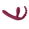 Three head strapless dildo with shared vibes and texture rich stimulation. All three heads deliver 10 vibration modes, and the remote lets you adjust the frequency on the fly adding extra stimulation and excitement to your play. The long head and the middle short features a defined glans and veins for lifelike friction, while the beaded, tapered end makes anal entry smooth and progressive. Designed for couples perfect for lesbian partners or pegging the two shorter ends anchor inside so you can go hands free and enjoy deep, synchronized pleasure together.